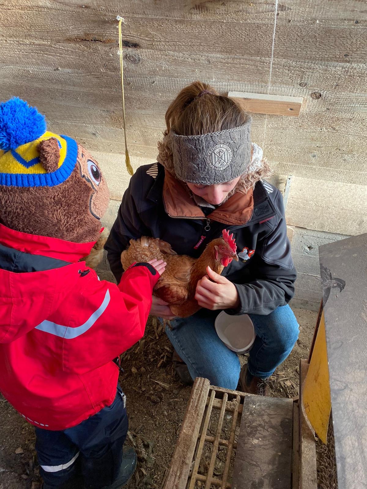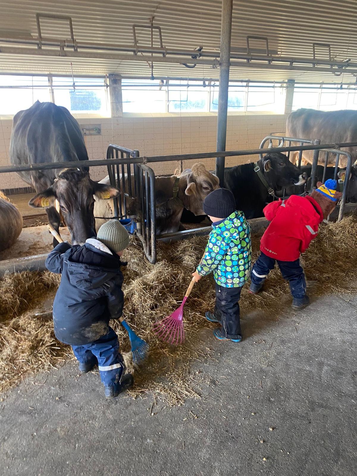 Hast du deine Adleraugen geschärft? Wir entdecken den ganzen Bauernhof mit Kühen, Säuli, Hühnern, Pferden usw. Auch Bagger und Traktoren fehlen natürlich nicht. Nach vielen weiteren kleinen Aktivitäten und Abenteuern brutzeln wir uns über dem Feuer einen feinen Znüni direkt vom Hof.