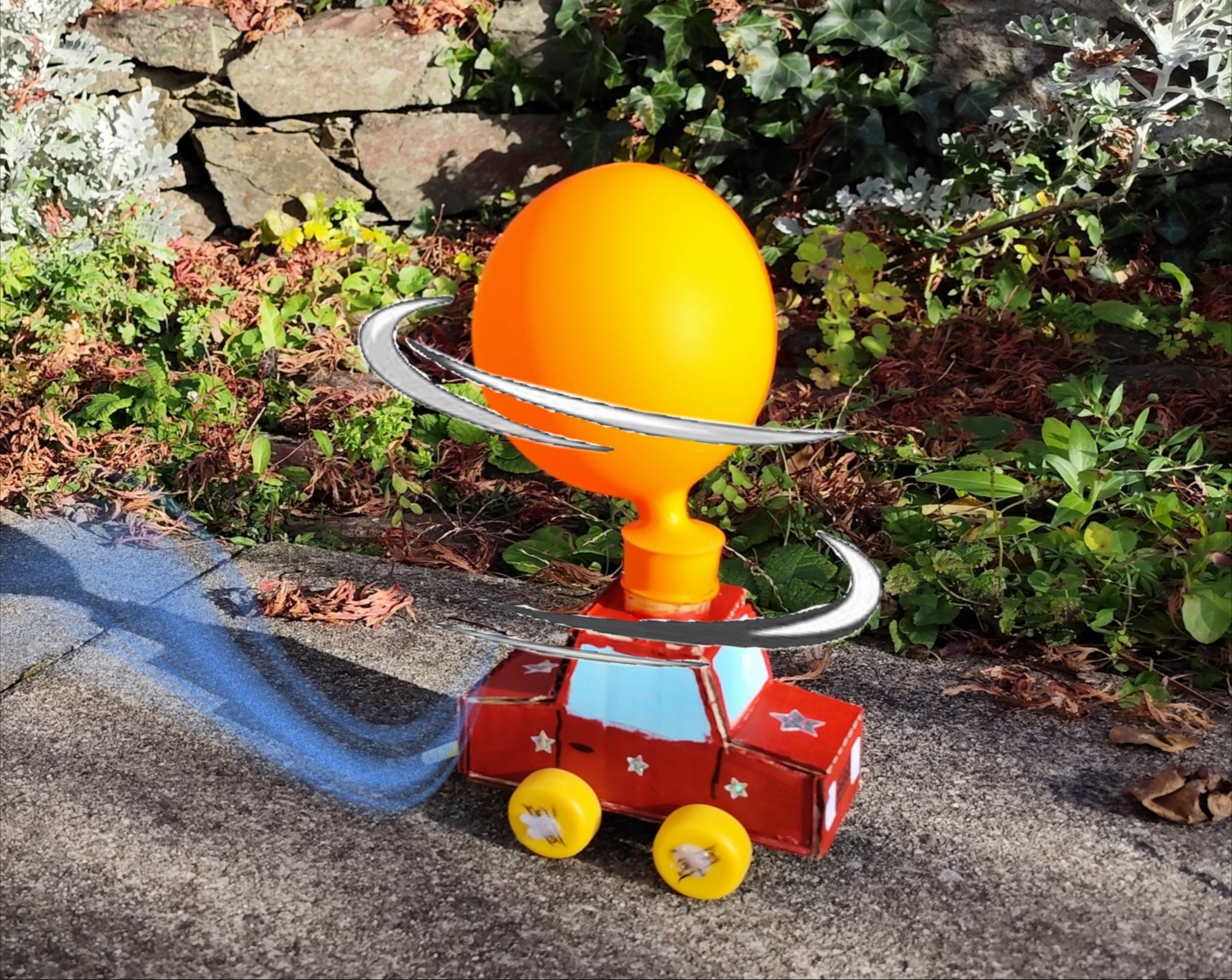 Aus Karton, Petflaschendeckel, einem Ballon und einer Konstruktion aus Strohhalmen baust du dein Luftauto