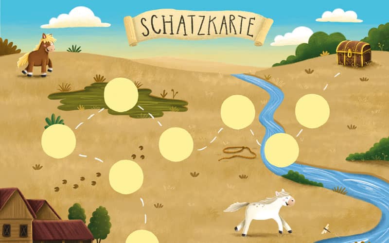 Wir treffen uns auf dem Hof und bereiten die Pferde auf die Schatzsuche vor. Gemeinsam machen wir uns auf die Suche nach dem Schatz. Über Wiesen durch den Wald führt uns das Abenteuer.